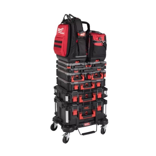 Особливості: Різні варіанти блокування: фронтальна педаль колеса з гальмом можливість зафіксувати візок для встановлення/зняття ящиків. Міцні колеса: витримують навантаження до 113 кг, розроблені для переміщення візка по будівельному майданчику. Універсальна та міцна система зберігання. Важіль із системою Quickstop утримує візок на одному помсті під час навантаження та розвантаження. Легко поєднується з інструментами серії PACKOUT.