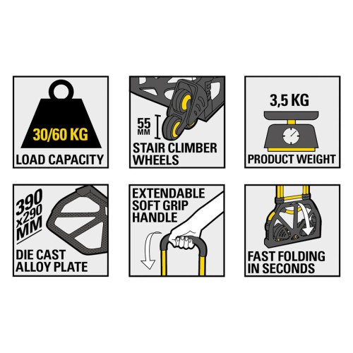 Вантажний візок Stanley SXWT-FT584 — ідеальний інструмент для перевезення коробок, побутової техніки чи інших важких предметів у квартирі, офісі, гаражі або під час переїздів. Візок має міцну алюмінієву конструкцію, яка витримує до 60 кг вантажу, при цьому власна вага всього 3.5 кг.