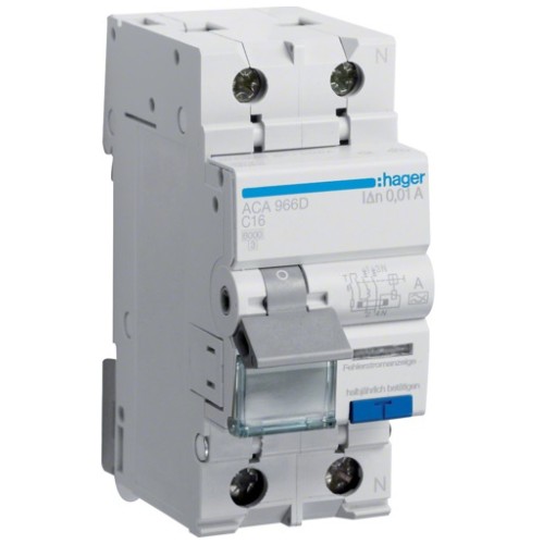 Диференціальний автоматичний вимикач Hager 1-п.+N 16A C 10mA (6kA) A (B) (ACA966D)
