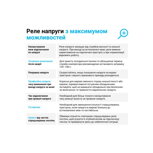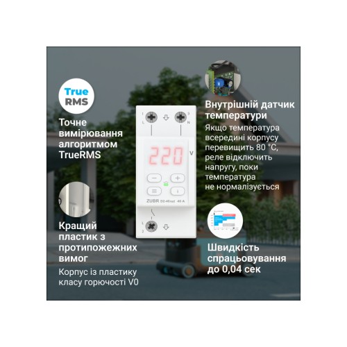 Завдяки інноваційному алгоритму TrueRMS, цей пристрій знижує вплив перешкод, гарантуючи точність вимірювання напруги навіть при неідеальній формі напруги. Особлива увага приділяється термозахисту: при підвищенні температури до 80 °С реле автоматично вимикає навантаження для запобігання перегріву.