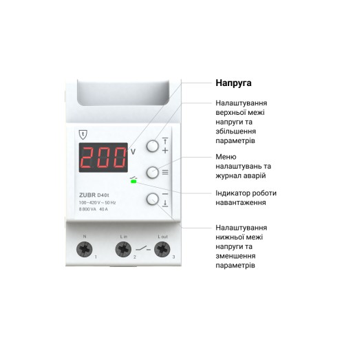 Реле напруги ZUBR D25t (4820120220449) - надійне рішення для захисту електрообладнання від коливань напруги. Завдяки допустимій потужності 5500 Вт, пристрій ефективно працює в робочому діапазоні від 120 до 280 В, забезпечуючи оптимальний захист.
