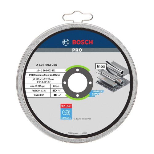 Bosch Stand PRO — це професійний відрізний диск для роботи з металом, діаметром 125 мм, товщиною 1.0 мм і посадковим отвором 22.2 мм. Поставляється в упаковці з 10 штук, ідеально підходить для точного та чистого різу чорного металу, сталі, труб, профілю та листового матеріалу.