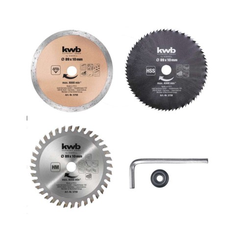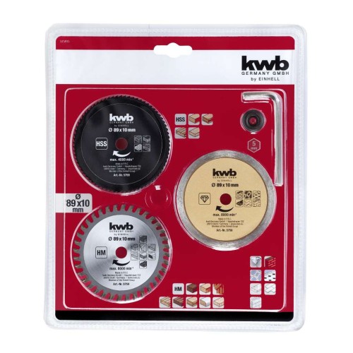 Набір дисків для роторайзера Einhell TC-CS 860 Kit і TC-CS 860/1 Kit ідеально підходить для різноманітних завдань різання. У комплекті алмазний диск для каменю та плитки, диск HW/HSS для роботи з деревом, а також HM/TCT диск для деревних матеріалів і пластику. Усі диски мають діаметр Ø89 мм і забезпечують високу точність різання. Комплект доповнюють шайба та гайковий ключ для зручного монтажу.