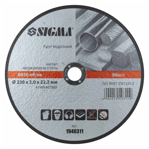 Круг відрізний Sigma по металу та нержавіючій сталі 230x2.0x22.2мм, 6650об/хв (1940311)