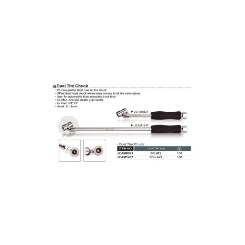 Насадка для підкачки коліс хромована JEAM1437 TOPTUL. Зміщений патрон головки забезпечує доступ до всіх типів автомобільних вентилів, спеціалізований для роботи з шинами вантажних автомобілів. Оснащений зручною, протиковзкою ручкою.