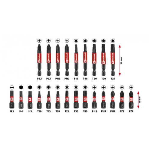 Довжина біт 25/50 мм. Біти виготовлені із сталі S2 Торсіонні біти для використання в ударних гвинтовертах. Магніт у битотримачі та головках для кращої фіксації кріплення. Прозора кришка для оптимального огляду вмісту. Кліпса з автоблокуванням для надійної фіксації кришки. Утримувачі біт в кейсі, що переставляються, для організації внутрішнього простору. Набір S-Case з 28 предметів Einhell відповідає вимогам як професійних майстрів, так і амбітних ентузіастів DIY. Всі частини набору біт мають односвітловий логотип на кольоровому кільці.