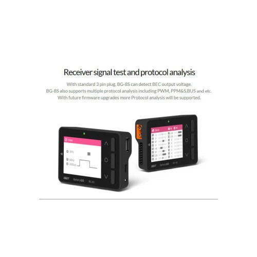 Тестування сигналу приймача та аналіз протоколу: за допомогою стандартного 3-контактного роз’єму BG-8S може визначити вихідну напругу BEC. BG-8S також підтримує багатопротокольний аналіз, включаючи PWM, PPM & S.BUS тощо. Додатковий аналіз протоколів буде підтримуватися з майбутніми оновленнями прошивки.