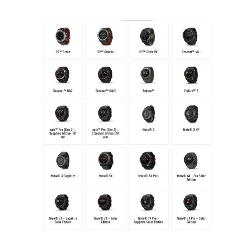 Garmin Enduro; Garmin Tactix Bravo; Garmin Tactix Charlie; Garmin Tactix Delta Sapphire; Garmin Descent Mk1; Garmin D2 Bravo; Garmin D2 Charlie; Garmin Descent Mk2i; Garmin Descent Mk2; Garmin Enduro 2; Garmin D2 Delta PX; Garmin Epix Pro (Gen 2); Garmin Instinct 2S; Garmin Fenix 3 HR; Garmin Quatix 3; Garmin Fenix 3; Garmin Fenix 5X; Garmin Fenix 5X Plus; Garmin Fenix 6X Pro; Garmin Quatix 6X Solar; Garmin Fenix 7X; Garmin Quatix 7X Solar; Garmin Fenix 7X Pro; Garmin Foretrex 601; Garmin Foretrex 701 Ballistic; Garmin Foretrex 801; Garmin Foretrex 901