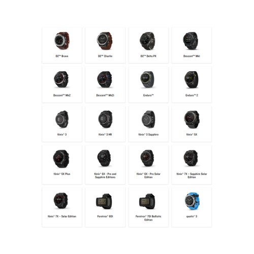 Garmin Enduro; Garmin Tactix Bravo; Garmin Tactix Charlie; Garmin Tactix Delta Sapphire; Garmin Descent Mk1; Garmin D2 Bravo; Garmin D2 Charlie; Garmin Descent Mk2i; Garmin Descent Mk2; Garmin Enduro 2; Garmin D2 Delta PX; Garmin Fenix 3 HR; Garmin Quatix 3; Garmin Fenix 3; Garmin Fenix 5X; Garmin Fenix 5X Plus; Garmin Fenix 6X Pro; Garmin Quatix 6X Solar; Garmin Fenix 7X; Garmin Tactix 7 Standard; Garmin Quatix 7X Solar; Garmin Foretrex 601; Garmin Foretrex 701 Ballistic