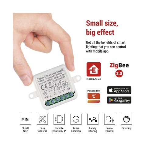 Розумний модуль регулювання яскравості EMOS H5108 дозволяє перетворити звичайне освітлення в елемент системи «розумний будинок». Працює за протоколом ZigBee 3.0 та підключається до хаба EMOS GoSmart або сумісних платформ TUYA, забезпечуючи стабільне бездротове керування. Модуль легко встановлюється в стандартну монтажну коробку та дозволяє дистанційно керувати освітленням через мобільний додаток.