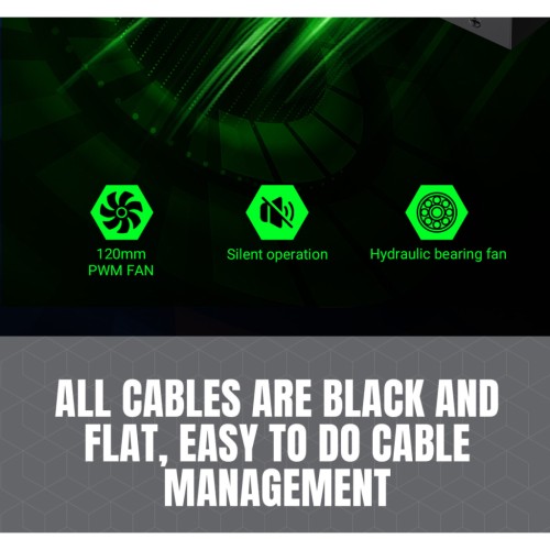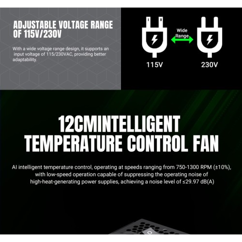 Інтелектуально керований вентилятор автоматично регулює швидкість обертання залежно від навантаження, забезпечуючи ефективне охолодження та низький рівень шуму.