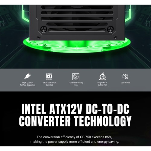 Потужна єдина лінія +12V гарантує надійне живлення високопродуктивних процесорів і відеокарт. GE-750 впевнено справляється з ігровими та професійними навантаженнями.
