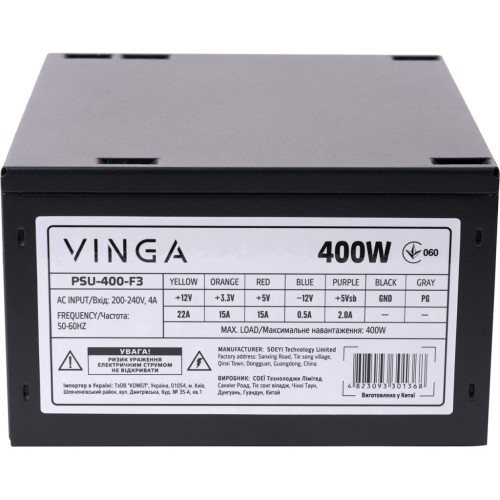 Блок живлення Vinga PSU-400-F3 розроблений для використання в офісних та інших малопродуктивних персональних комп'ютерах. Його потужності достатньо для інтегрованих відеокарт, а також графічних адаптерів, які отримують додаткове живлення з материнської плати.