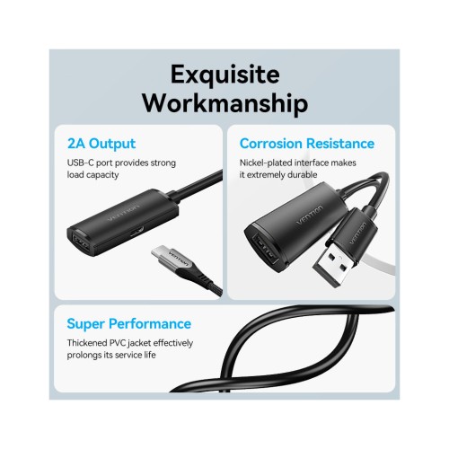 Активний подовжувач Vention 15 м USB 2.0 Type-A (тато) на Type-A (мама) з підсилювачем сигналу та додатковим живленням USB-C, Чорний