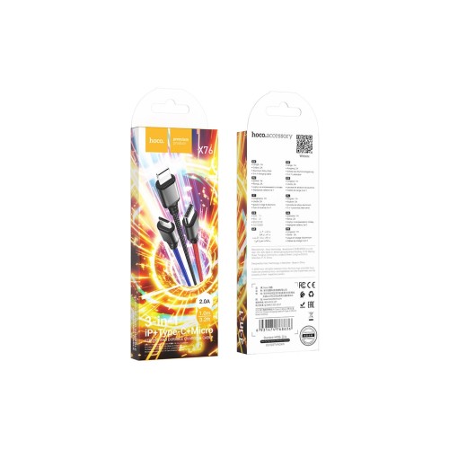 Універсальний кабель Hoco X76 3 in 1 USB to Lightning / Type-C / Micro-USB розширить можливості для своїх власників, оскільки дозволяє одночасно підключити три пристрої. Він підійде практично до всіх гаджетів, що використовуються, без застосування безлічі перехідників і адаптерів. Довжина дроту становить 1 м, чого буде більш ніж достатньо для зручного використання.