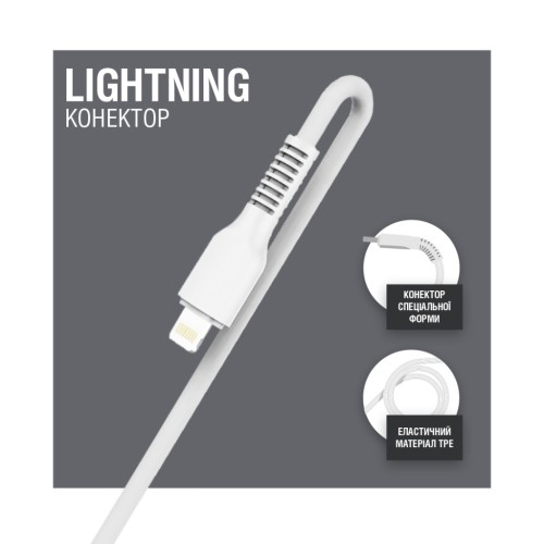 Кабель синхронізації ACCLAB USB to Lightning зручної довжини 1.2 м незамінна річ для заряджання телефонів та планшетів. Виготовлений із пластичного екологічного матеріалу TPE. Конектор спеціальної гнучкої форми. Підтримує швидку зарядку 2.4А
