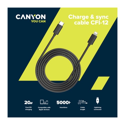 Цей кабель Canyon CNE-CFI12 Lightning to USB-C допоможе вам швидко зарядити та синхронізувати всі пристрої Apple, такі як iPhone або iPad. Просто підключіть смартфон до порту USB ноутбука, і ви зможете заряджати телефон і синхронізувати дані. Головною характеристикою є те, що потужність 20 Вт та протокол Power Delivery забезпечують максимальну та швидку швидкість заряджання. Оптимальна довжина кабелю (2 метри) дозволяє комфортно розмістити підключений пристрій під час заряджання від мережі.