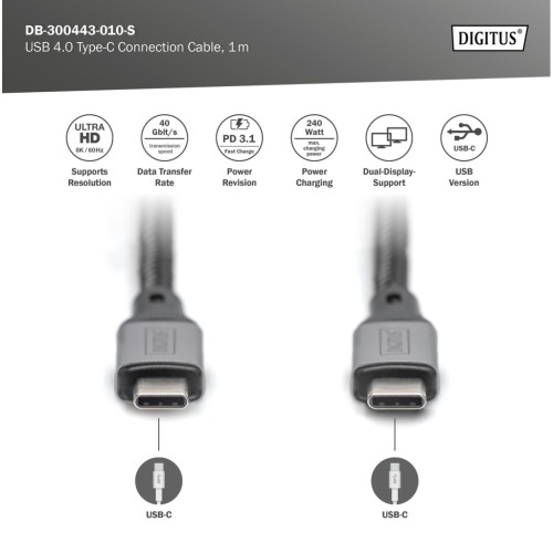 Дата кабель USB-C to USB-C 1.0m USB 4.0 black Digitus (DB-300443-010-S)