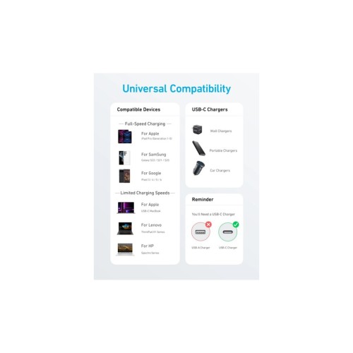 Підтримує максимальну вихідну потужність 60 Вт або більше для живлення практично будь-якого пристрою USB-C, включно з телефонами, планшетами та ноутбуками (за умови використання зарядного пристрою на 60 Вт або більше.