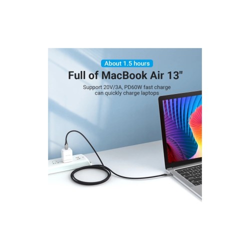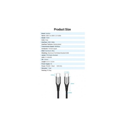 Кабель Type-C-Type-C 3.1 Vention TPE Nylon Thunderbolt 3 4K 60Hz PD 60W 3A 480Mbps nickel-plated забезпечує безпечне заряджання до 3А для ваших ноутбуків / мобільних телефонів / планшетів.