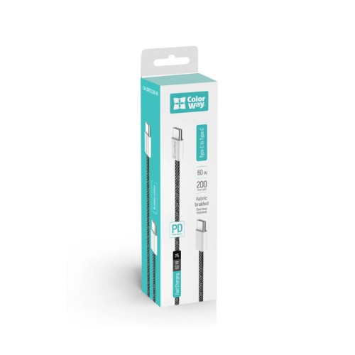 Дата кабель USB-C to USB-C 2.0m (braided cotton) (PD Fast Charging 60W) 3.0А black ColorWay (CW-CBPDCC068-BK)