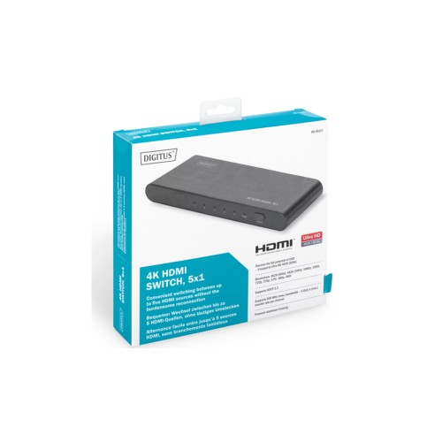 Комутаційний перемикач Digitus 4K HDMI 5x1 дозволяє здійснювати зручне перемикання 5 вхідних джерел HDMI (плеєр DVD/Blu-ray, ігрова приставка, пристрій відтворення/медіаплеєр, цифровий ресівер і т. д.) за допомогою дистанційного керування, за допомогою інтелектуального автоматичного розпізнавання або, як альтернативу, за допомогою перемикача на комутаторі. Трудомісткий процес перемикання кабелів відходить у минуле. Підтримка Ultra HD 4K (60 Гц) дозволяє насолоджуватися медіаконтентом виключно чіткою роздільною здатністю.