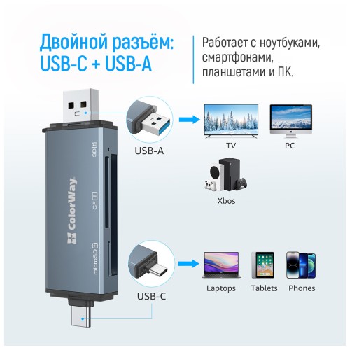 ардрідер ColorWay 3-в-1 — компактний та стильний пристрій у формі брелока для зручного зчитування та запису даних з карт памʼяті. Оснащений одразу двома конекторами — USB-C та USB-A — що дозволяє підключати його до ноутбуків, ПК, планшетів і смартфонів із підтримкою OTG. Підтримує карти памʼяті форматів CF, SD та MicroSD (TF) обсягом до 2 ТБ.