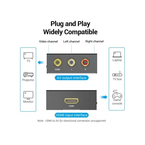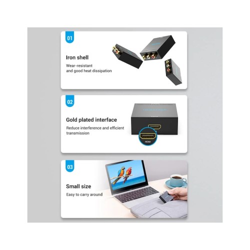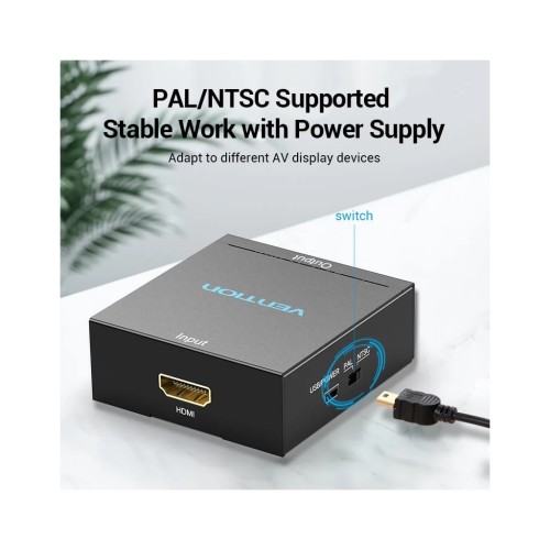 Vention HDMI-VGA (AEEB0) — це перетворювач, який перетворює цифровий сигнал HDMI на аналоговий відеосигнал AV (RCA). Таким чином, можна під'єднати сучасні пристрої з обладнанням HDMI Antance Standard до обладнання AV (RCA). Конвертер підтримує технологію підключення та відтворення, тому не потрібне додаткове програмне забезпечення та драйвери.