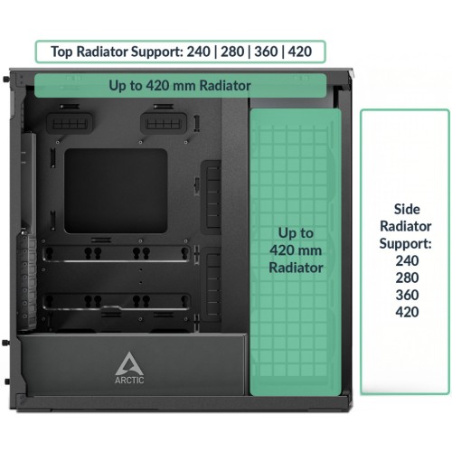 Великий внутрішній об’єм корпусу дозволяє встановлювати як повітряні кулери великого розміру, так і габаритні СВО з радіаторами на кілька вентиляторів. Оптимізована вентиляція гарантує стабільну роботу системи навіть під високими навантаженнями. Завдяки ретельно продуманій конструкції ARCTIC Xtender VG підтримує баланс між продуктивністю та низьким рівнем шуму.