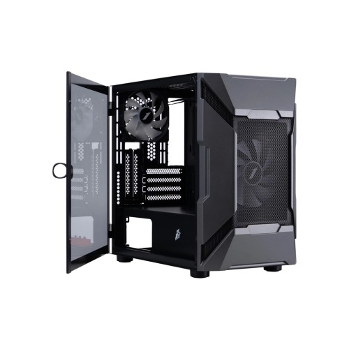 Підтримка материнських плат Micro-ATX і Mini-ITX дозволяє легко налаштувати системну архітектуру згідно з вашими потребами. Внутрішній простір корпусу оптимізований для зручного встановлення компонентів, забезпечуючи два внутрішні відсіки для жорстких дисків 3.5" і два для твердотільних накопичувачів 2.5". Це забезпечує достатній простір для великих обсягів зберігання, що важливо для будь-якої продуктивної системи.