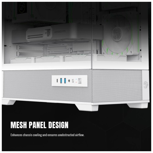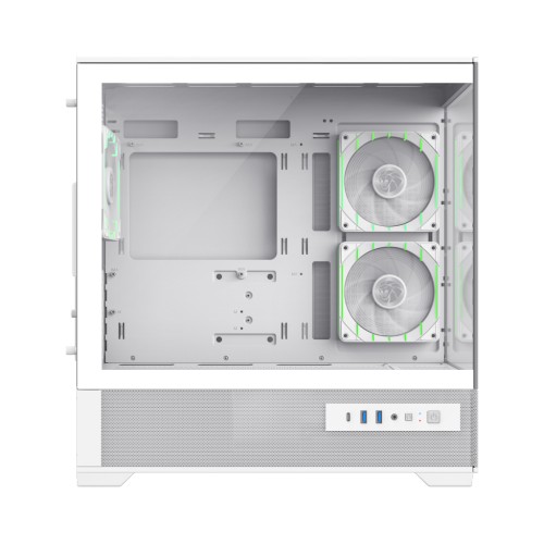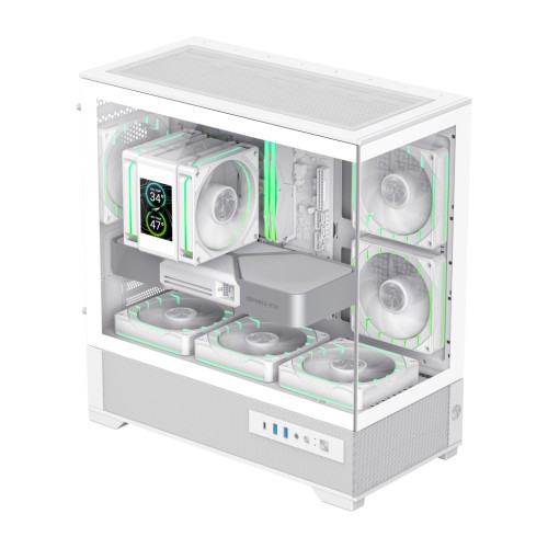 Передня та ліва бокова панелі виконані із загартованого скла, що забезпечує широкий 270° огляд внутрішніх компонентів. Це дозволяє продемонструвати підсвічування, систему охолодження та сучасну відеокарту у всій красі.