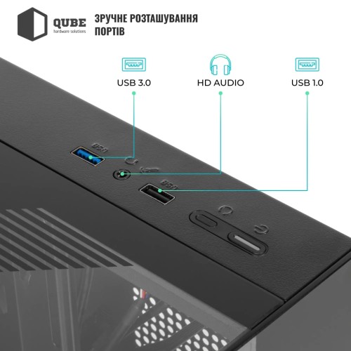 Qube AQUARIUM_GBNU3 також порадує практичністю зовнішніх інтерфейсів: два порти USB 2.0, один USB 3.0 та два аудіороз'єми забезпечують зручність підключення периферійних пристроїв, роблячи щоденне користування максимально комфортним. Цей корпус здатен вмістити відеокарти довжиною до 330 мм, що робить його ідеальним для будь-яких ігрових або професійних систем.