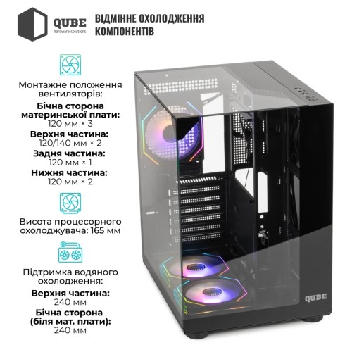 Корпус для ПК Qube AQUARIUM_GBNU3 - це вершина інженерної думки, створена для тих, хто цінує не лише продуктивність, але і стильний зовнішній вигляд свого комп'ютера. Виготовлений з міцної сталі класу SPCC товщиною 0,45–0,55 мм, цей корпус витримує будь-які експлуатаційні навантаження, забезпечуючи надійний захист ваших компонентів. Фронтальна і бокова панелі, виконані з загартованого скла, не лише стильно виглядають, але й дозволяють милуватися внутрішнім наповненням вашої системи, підкреслюючи її індивідуальність.