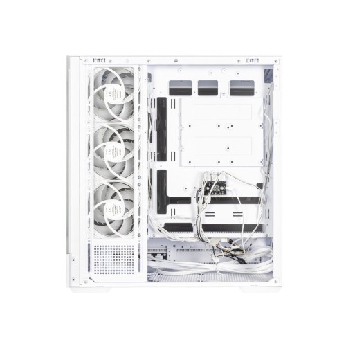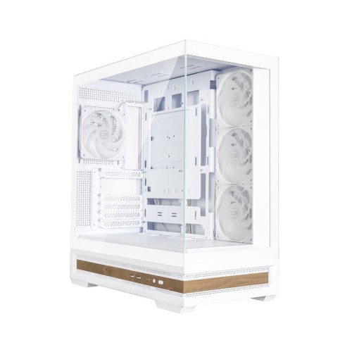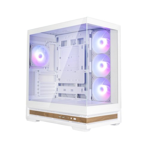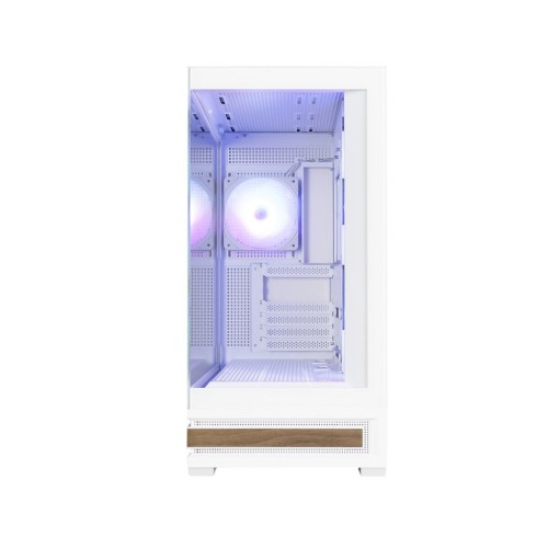 Корпус виготовлено з високоякісних матеріалів, що забезпечує його надійність та довговічність. Його білий колір надає естетичної привабливості, що гармонійно вписується в будь-який інтер'єр. Фасад корпусу виконано з прозорого загартованого скла, що дозволяє вам насолоджуватись видом на внутрішні компоненти комп'ютера. Бічна панель також прозора, що підкреслює елегантність і надає відчуття простору.