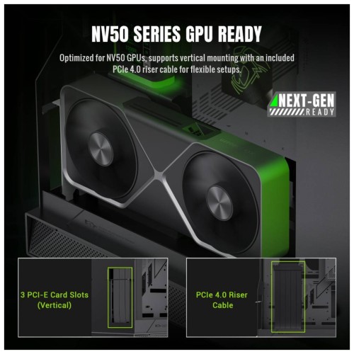 • Підтримка відеокарти серії NV50 з підтримкою вертикального монтажу відеокарти за допомогою кабелю-розподільника PCIe 4.0, що входить до комплекту, для універсальних налаштувань.