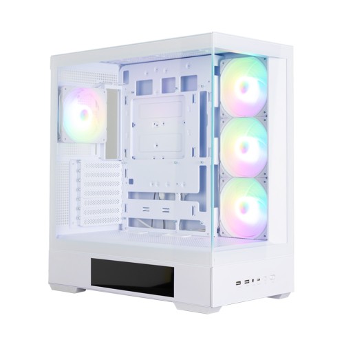 Панорамний корпус Zalman P40 DS WHITE з 9,1 дюймовим дисплеєм для сучасної домашньої або ігрової станції, сумісний із актуальними компонентами та адаптований для BTF материнських плат. Передня та бічна панелі із загартованого скла. Забезпечено активне обдування компонентів за рахунок перфорації металевої поверхні панелей корпусу. Продумано захист від пилу. У комплекті 4 х 120мм ARGB вбудованих вентиляторів, концентратор та тримач для відеоадаптера. Вентилятори на бічній панелі – реверсні: забезпечують приплив повітря ззовні. Вентилятор на задній панелі працює на видув. Додаткова опція – дисплей з роздільною здатністю 1920х462 на бічній панелі, який демонструє в реальному часі інформацію про процесор, відеоадаптер, пам'ять і вентилятори корпусу. Корпус укомплектований усіма необхідними деталями для складання та подальшої експлуатації, в наявності стандартні сучасні актуальні інтерфейси, роз'єми, а також програмне забезпечення, яке можна завантажити з офіційного сайту виробника.