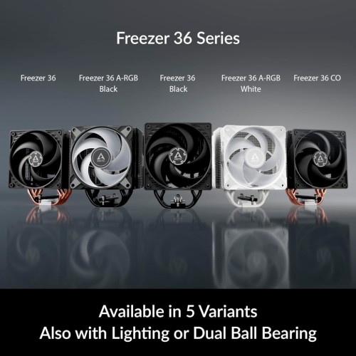 Freezer 36 доступний у п'яти різних версіях, кожна з яких оснащена двома вентиляторами в конфігурації push-pull. Крім стандартної моделі з алюмінієвим радіатором, доступна також версія з чорним радіатором. Для безперервної роботи існує також версія CO, оснащена вентиляторами з подвійними шарикопідшипниками. Крім того, користувачі можуть вибрати між чорною і білою версією з вентиляторами ARGB.