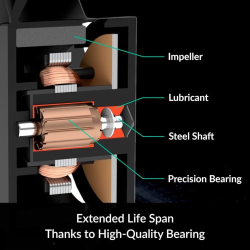 Завдяки комбінації сплаву і мастила, розробленої в Німеччині, тертя в підшипнику зводиться до мінімуму і досягається велика ефективність. Крім запобігання втрати мастила, знос пальця і втулки також зводиться до мінімуму. Таким чином, виділяється менше тепла, знижується шум від підшипника і значно збільшується термін служби вентилятора.