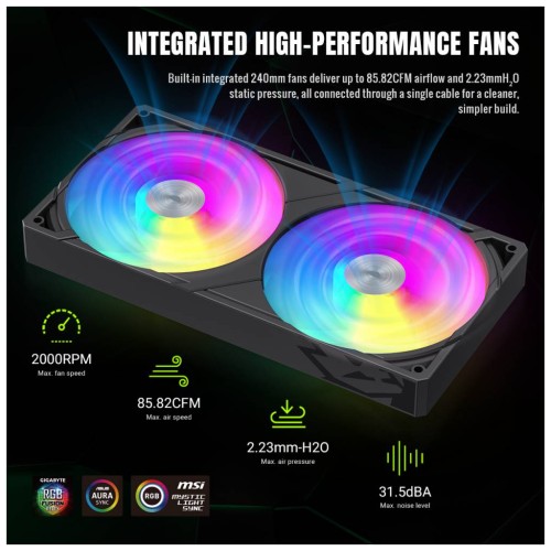 Вбудовані вентилятори забезпечують повітряний потік до 85,82 CFM і статичний тиск 2,23 ммH₂O, гарантуючи ефективне відведення тепла. Один кабель підключення робить збірку простішою та акуратнішою.