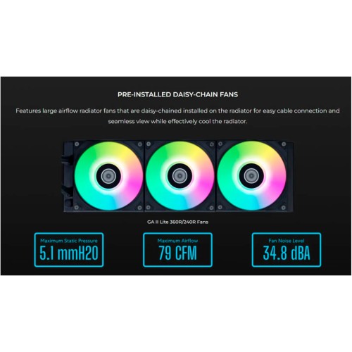 Lian-Li GA II Lite 240P — це надійна система водяного охолодження з радіатором і трьома 120-мм вентиляторами. Вона призначена для охолодження процесора, забезпечення його стабільної роботи та ефективного відведення тепла. Швидкість обертання кулера досягає 2500 об/хв.