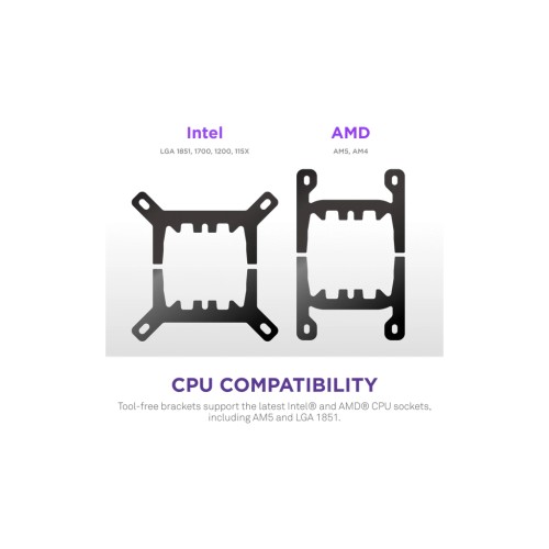 Включає монтажні кронштейни без інструментів, які підтримують найновіші роз'єми процесорів AMD та Intel, включаючи AM5 та LGA 1851.