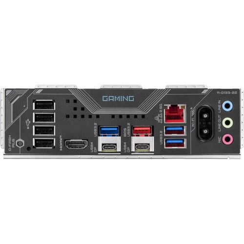 3 x USB 3.2 Gen 1; 2 x SMA antenna connectors (2T2R); 1 x Q-Flash Plus button; 1 x USB 3.2 Gen 2 10Gbps (Type-A); 2 x USB4 (40Gbps) ports (2 x USB Type-C); 1 x RJ45; 4 x USB 2.0; 1 x HDMI; 3 x Audio