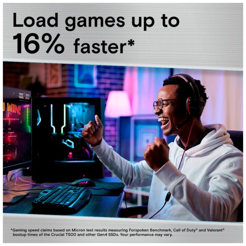 Прискорення завантаження, завантаження та збереження за допомогою послідовного читання/запису 7400/7000 МБ/с — Crucial T500 PCle 4.0 NVMe SSD більш ніж у 2 рази швидший, ніж Gen3 SSD, і в 12 разів швидше ніж SATA.