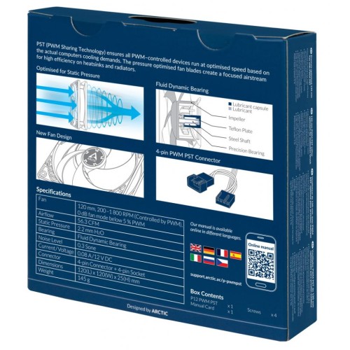Arctic Cooling P12 PWM - надійний корпусний вентилятор від відомого виробника. Виготовлений із якісного пластику на основі надійного гідродинамічного підшипника, що забезпечить високу продуктивність роботи та тривалий термін роботи до відмови. Також, Arctic Cooling P12 PWM підтримує керування PWM, що дозволить материнській платі точно контролювати його оберти для ідеального співвідношення між шумом та ефективністю охолодження. Використання потужного вентилятора (його швидкість обертання становить 1800 об/хв) забезпечить систему прохолодою та гарантує її стабільну роботу. Вентилятори Arctic P-Fan мають продуману форму лопатей, спеціально «заточених» для високого статичного тиску.