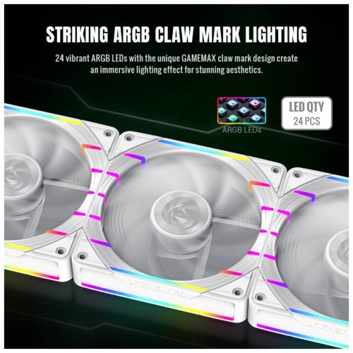 Приголомшливе ARGB-підсвічування: 24 ARGB-світлодіоди створюють унікальний ефект сліду кігтя GameMax. Підтримує синхронізоване регулювання підсвічування з материнською платою, додаючи естетики кіберспорту до вашого корпусу ПК.