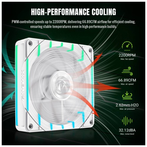 • Потужне охолодження: Завдяки ШІМ-регулюванню температури він досягає високої швидкості 2200 об/хв та забезпечує потужний повітряний потік 66.89 кубічних футів за хвилину, забезпечуючи стабільну роботу хоста під великими навантаженнями.
