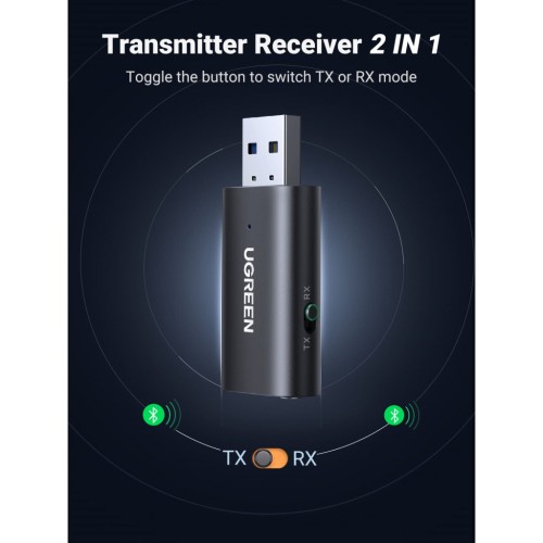 Передавач і приймач Bluetooth 2 в 1: передавач Bluetooth UGREEN 3,5 мм для телевізора підтримує як передачу, так і приймання Bluetooth, а саме режим TX і RX. Режим RX підтримує одночасне використання двох пристроїв, як-от автомобільна стереосистема та домашня стереосистема, а режим TX підтримує одночасне використання одного пристрою, як-от телевізор або ПК.