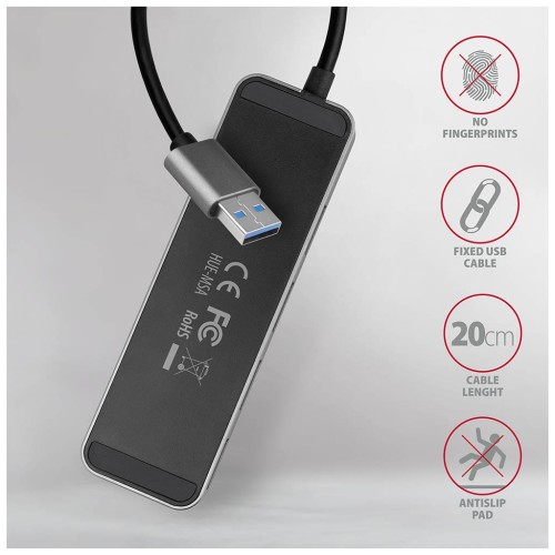 Корпус AXAGON HUE-MSA виготовлено з міцного алюмінію, який забезпечує надійний захист від механічних пошкоджень і сприяє ефективному відведенню тепла. Гумові ніжки запобігають ковзанню, а приємна на дотик матова поверхня не залишає відбитків. Завдяки компактним розмірам 102 × 31 × 10 мм і вазі лише 39 г пристрій легко поміщається на столі чи в сумці поруч із ноутбуком.