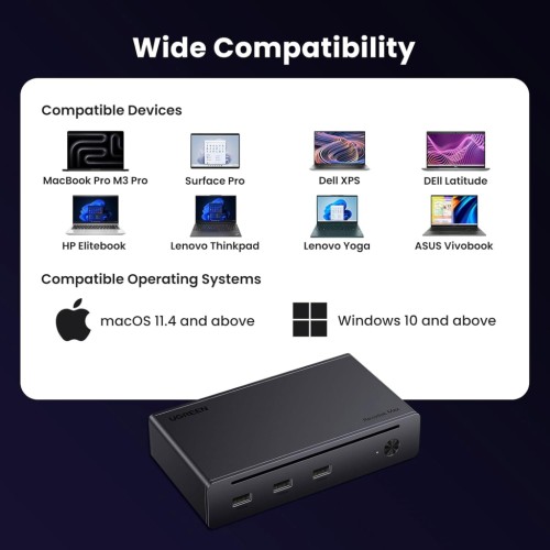 Три порти USB-A 3.2 Gen 2 дозволяють підключати периферійні пристрої зі швидкістю до 10 Гбіт/с, а RJ45 Gigabit Ethernet забезпечує стабільне інтернет-з'єднання. Док-станція також підтримує зарядку ноутбука до 85 Вт та живлення підключених пристроїв через вхідний адаптер 140 Вт.