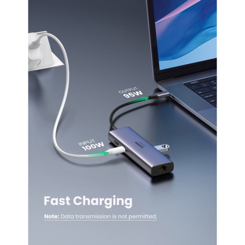 • Наскрізна зарядка PD 100 Вт: док-станція обладнана вбудованим входом Type-C, тому ви можете заряджати, маючи доступ до декількох периферійних пристроїв. Живлення розподіляється між усіма під'єднаними до до док-станції пристроями USB-C і регулюється залежно від потреб. Концентратор забезпечує майже 95 Вт для заряджання під'єднаного ноутбука та 5 Вт для живлення концентратора під час під'єднання до вхідної потужності 100 Вт.